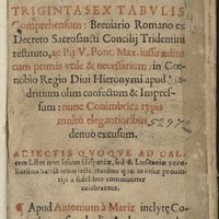 Calendarium perpetuum triginta sex tabulis comprehensum ; Breuiario romano ex decreto sacrosancti Concilij Tridentini restituto ac Pij V Pont. Max. iussu aedito cum primis utile et necessarium in coenobio regio Diui Hieronymi apud Madritium olim confectum et impressum nunc Conimbrica typis multò elegantioribus denuò excusum ..